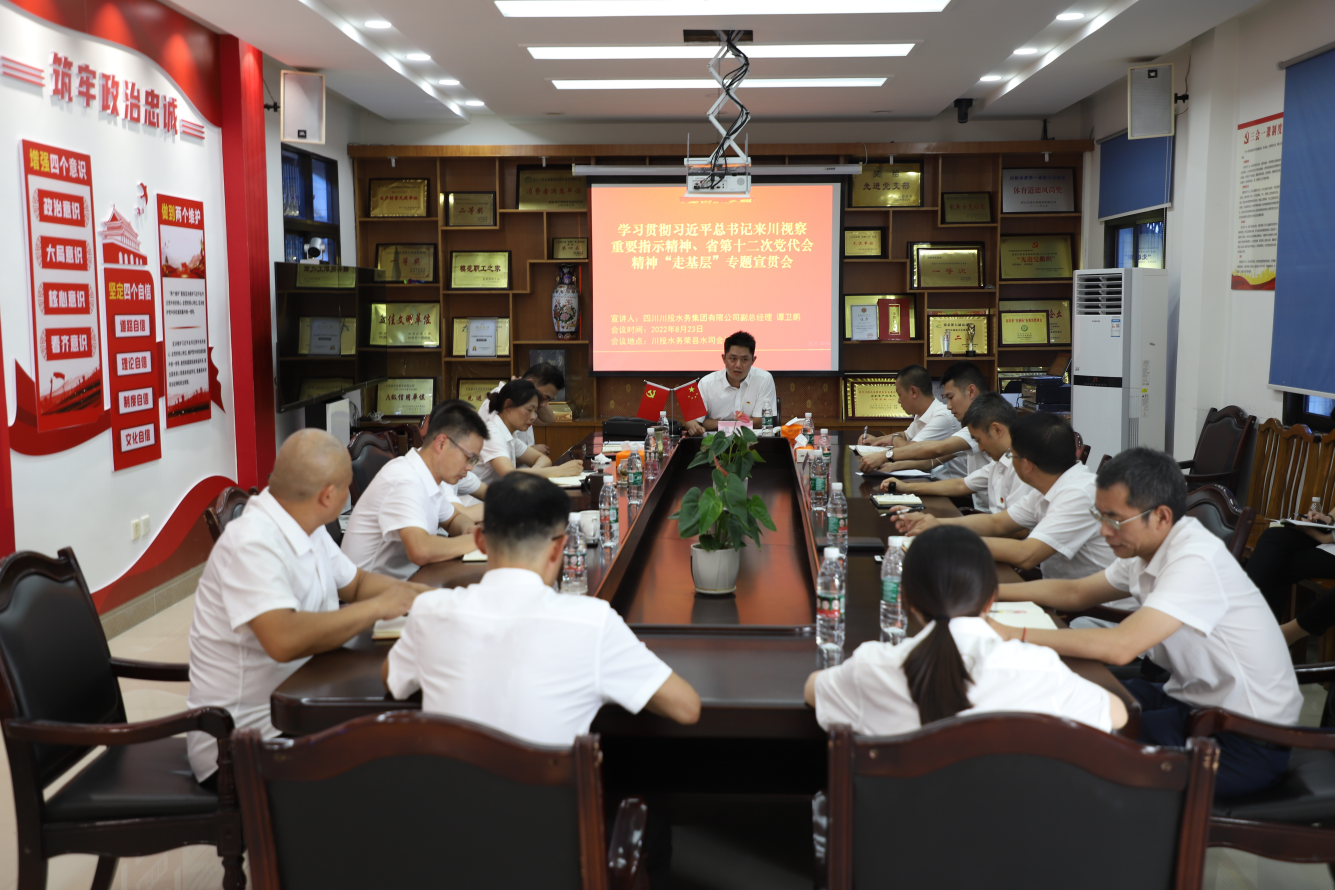 为坚持以习近平新时代中国特色社会主义思想为指导,贯彻落实习近平总书记对四川工作系列重要指示精神,根据PA视讯集团党委《关于认真做好学习贯彻习近平总书记来川视察重要指示精神和省第十二次党代会精神“走基层”专题宣讲的通知》文件要求,8月23日下午,PA视讯集团副总经理谭卫鹏一行赴荣县水司开展学习贯彻习近平总书记来川视察重要指示精神暨省第十二次党代会精神“走基层”专题宣讲活动,荣县水司领导班子成员、党员干部参加了活动。