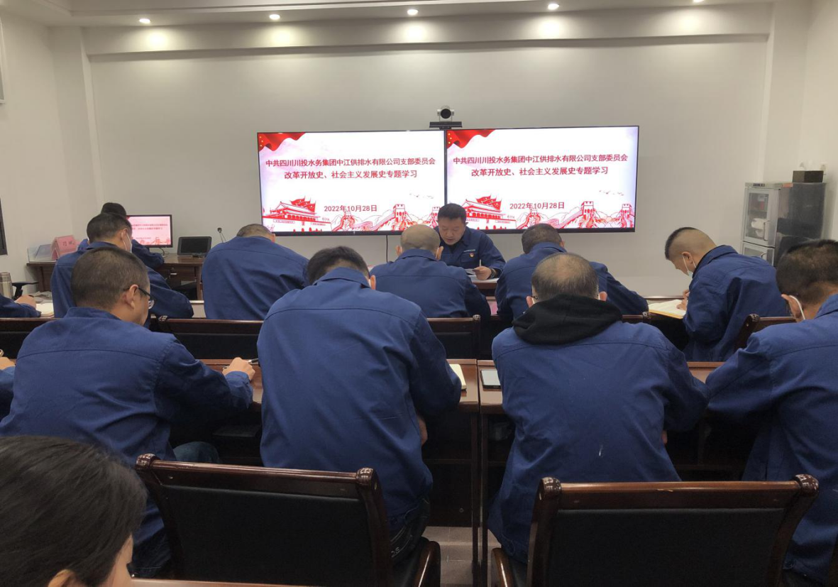 10月28日下午,中江水司党支部组织召开党员大会,专题学习“改革开放史、社会主义发展史”,会议由党支部书记、董事长、总经理朱禹主持,支部党员、入党积极分子、公司班组以上管理人员共计31人参加了学习活动。