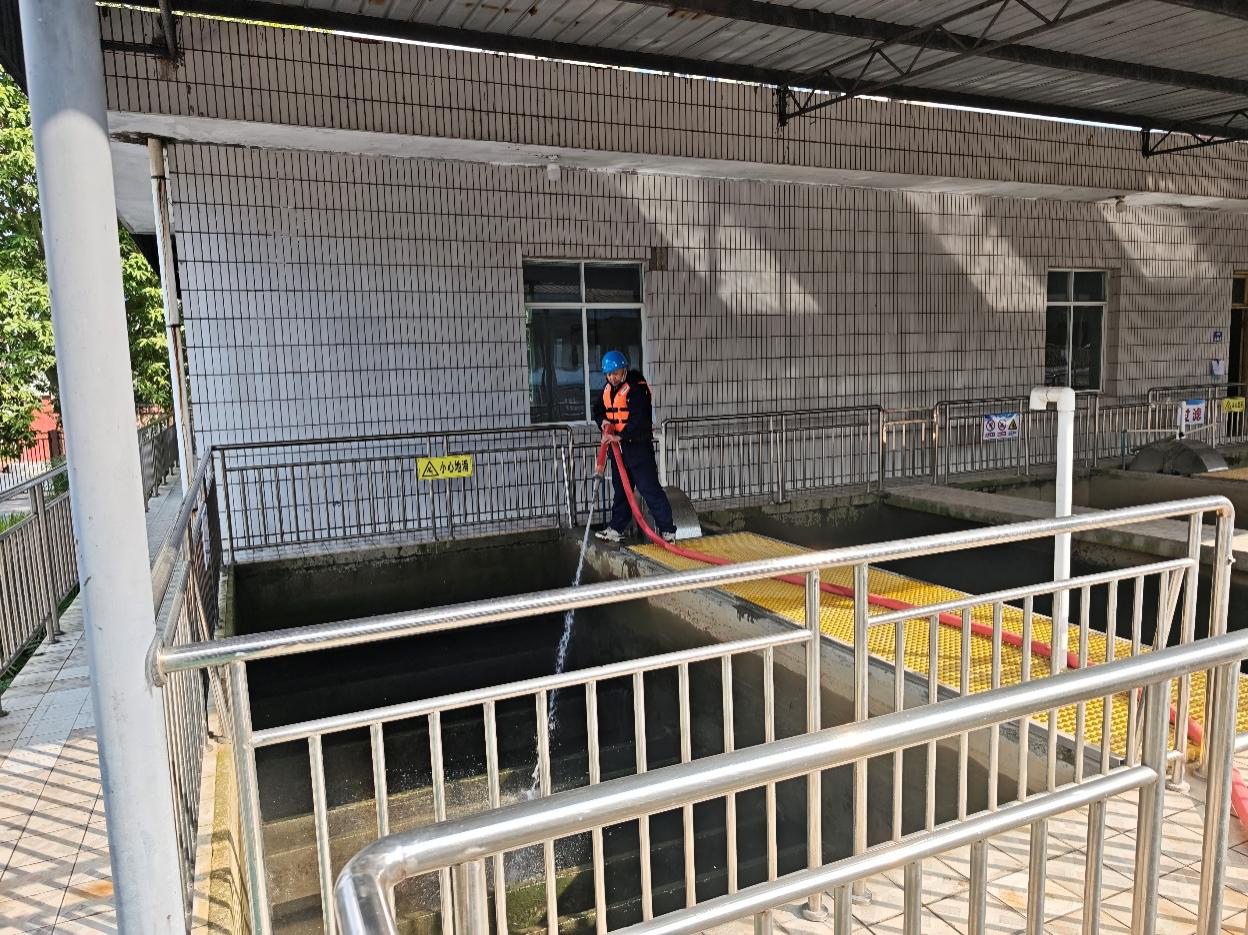 本次活动坚持逐项推进、逐点落实,重点开展多方面环境整治与设施维护工作:全面清理池面及护栏的鸟粪、蛛网与积尘,消除滑倒安全隐患;使用高压水枪冲洗滤池池壁青苔,提升滤池水处理效率;及时打捞旋转反应池、滤池内的泡沫和漂浮物,保持水面洁净无杂物;对加氯间、送水泵房、配电室开展除尘清扫,保障设备散热及正常运行,为夏季高温时段制水工作筑牢基础。