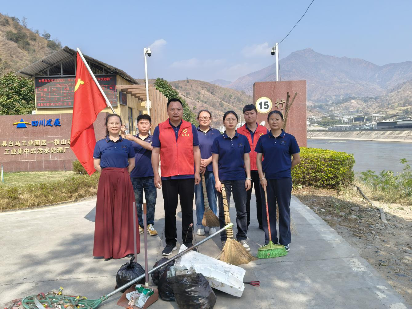 活动现场,公司党支部书记带领党员和职工,手持扫帚、铁铲、垃圾夹、环保垃圾袋等工具,对厂外道路两侧的白色垃圾、散落杂物以及厂区段河岸沿线的塑料瓶、食品包装袋、枯枝杂草等进行了全面、细致的清理。