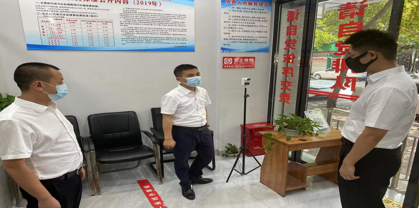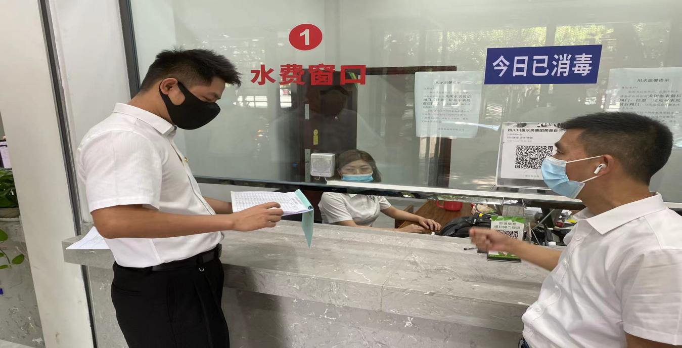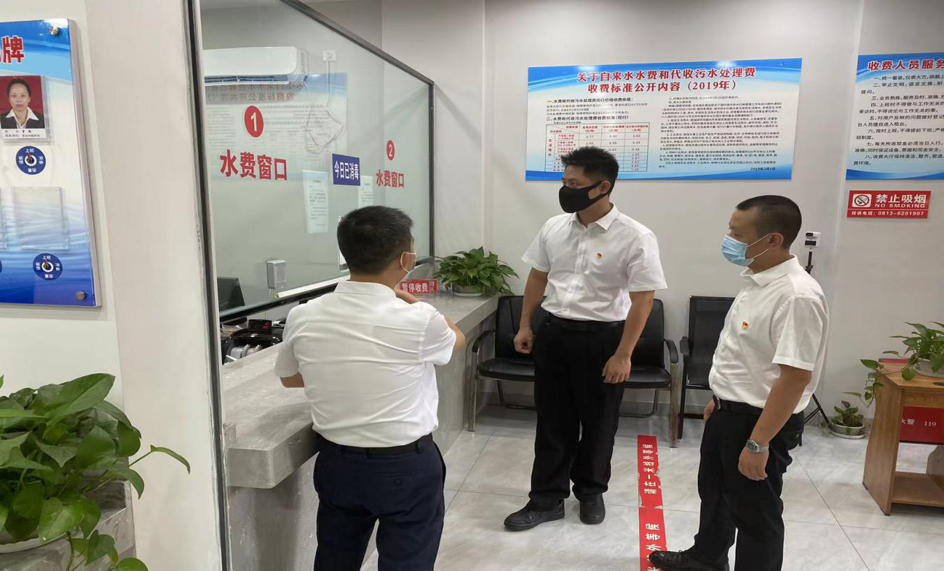 荣县水司服务大厅下午上班时间为2点30分,督导组2点25分到达在服务大厅门口,首先是针对缴费群众的排队情况、防疫一米间距标识、疫情防控“扫描、亮码”、管控措施等进行检查。2点28分,进入服务大厅检查员工是否准时到岗、着装、便民服务设施等进行检查,并仔细查看了防疫情况登记表及防疫物资存备情况。2点50分,检查组又前往荣县水司行政办公区、厂区、门岗等区域开展突击检查,对员工的到岗情况及未到岗人员逐个询问核实去向,并针对疫情防控、防汛抗旱保供情况进行现场询问。