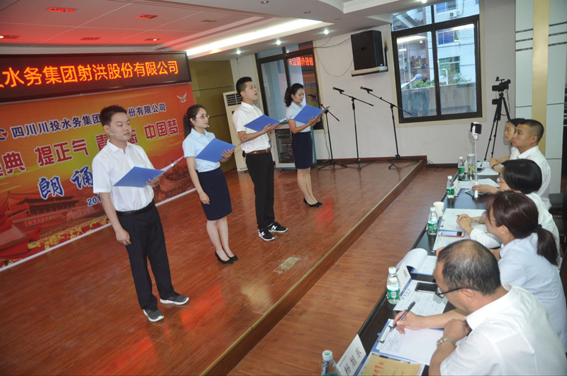 本次比赛评委由射洪县新闻中心主任马海艳和公司总经理李泉及其他班子成员共5人组成。比赛采取现场打分,现场公布方式,去掉一个最高分,去掉一个最低分取平均分计名次,公司共计29名员工以单人朗诵和多人朗诵的形式,共10个节目参加了本次比赛。经过激烈角逐,王纤羽、黄雪梅、陈锦苹三人朗诵的原创作品《青春的名义》荣获第一名。