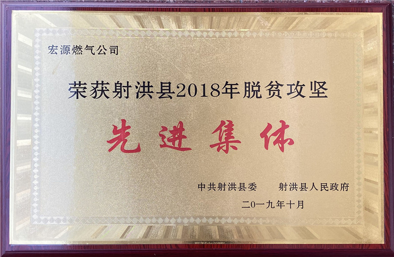2019年10月15日,在射洪县文化艺术中心召开的“大爱扶贫 济善射洪—2019年射洪县脱贫攻坚暨社会扶贫工作推进会”上,宏源公司被中共射洪县委、射洪县人民政府表彰为“射洪县2018年度脱贫攻坚先进集体”,公司团委书记、大榆镇飞石沟村驻村工作队队员刘军被表彰为“射洪县2018年度脱贫攻坚先进个人”。