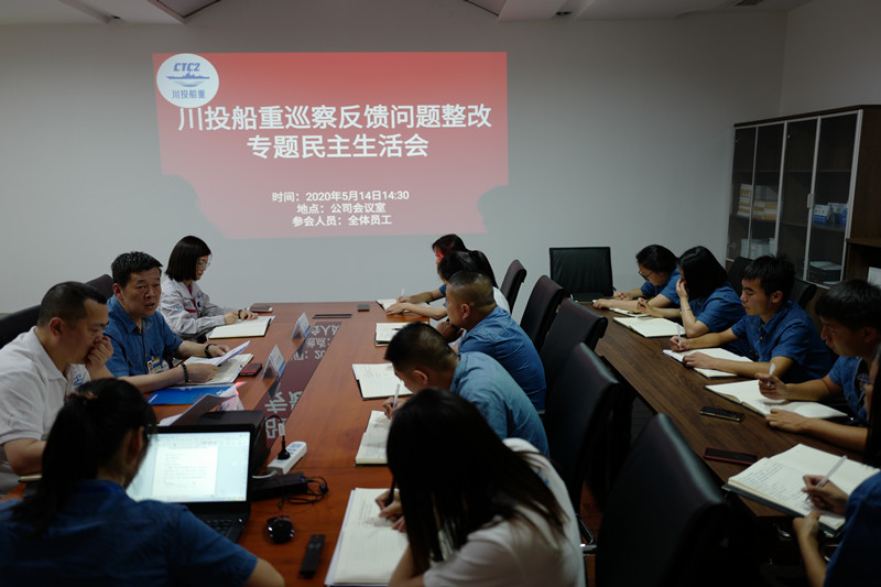 根据省国资委第二巡察组要求,按照PA视讯集团党委《关于落实省国资委第二巡察组巡察反馈意见的整改方案》,四川川投船重环境科技有限公司于2020年5月14日召开巡察反馈问题整改专题民主生活会,会议由总经理马铭伟主持,全体员工参加会议。