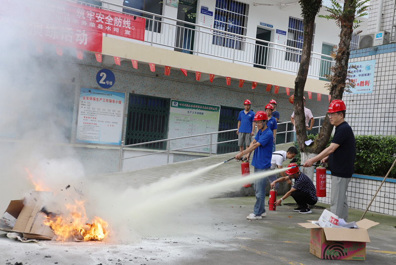 下午3点,在进行消防应急演练前,首先由公司安全管理人员对干粉灭火器的基本情况及如何正确使用进行了详细讲解。随后,在厂区院坝模拟突发火灾情况下,干部职工正确使用干粉灭火器材对突发情况进行灭火,全力将火扑灭。