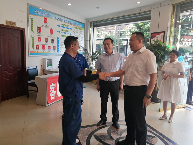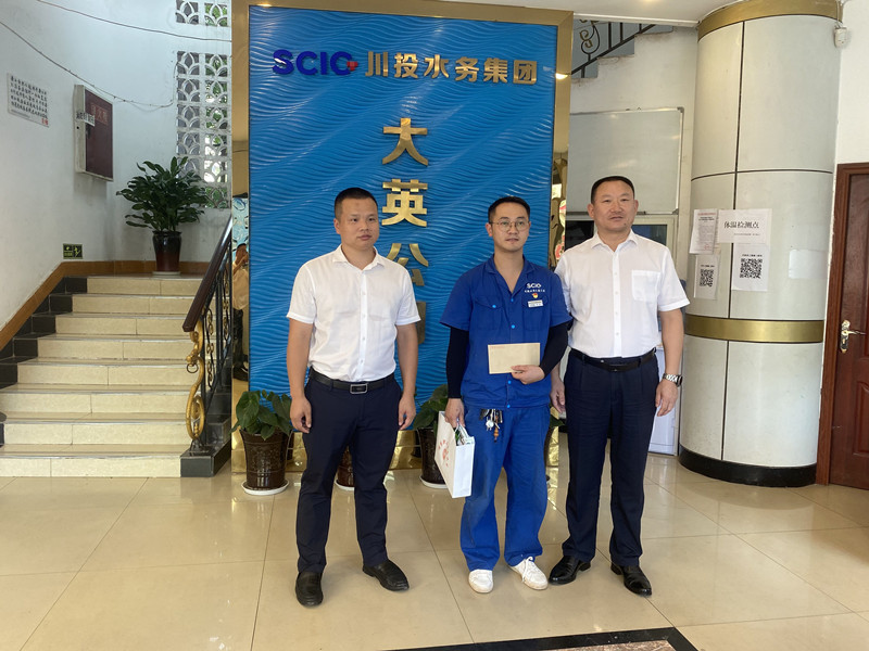 8月10日下午5时30分,大英县委副书记、县长胡铭超,县委常委、县委办公室主任、县总工会主席谭银,遂宁市中国死海旅游度假区管委会副主任敬云川等领导来到PA视讯大英水司老城服务大厅,向前几日为最大限度保障供水、降低停水影响、毅然5次潜下灌满消防水的闸阀井关闭闸阀而引发社会广泛关注的PA视讯大英水司“开关侠”魏巍表达问候和祝福,并送上慰问金。