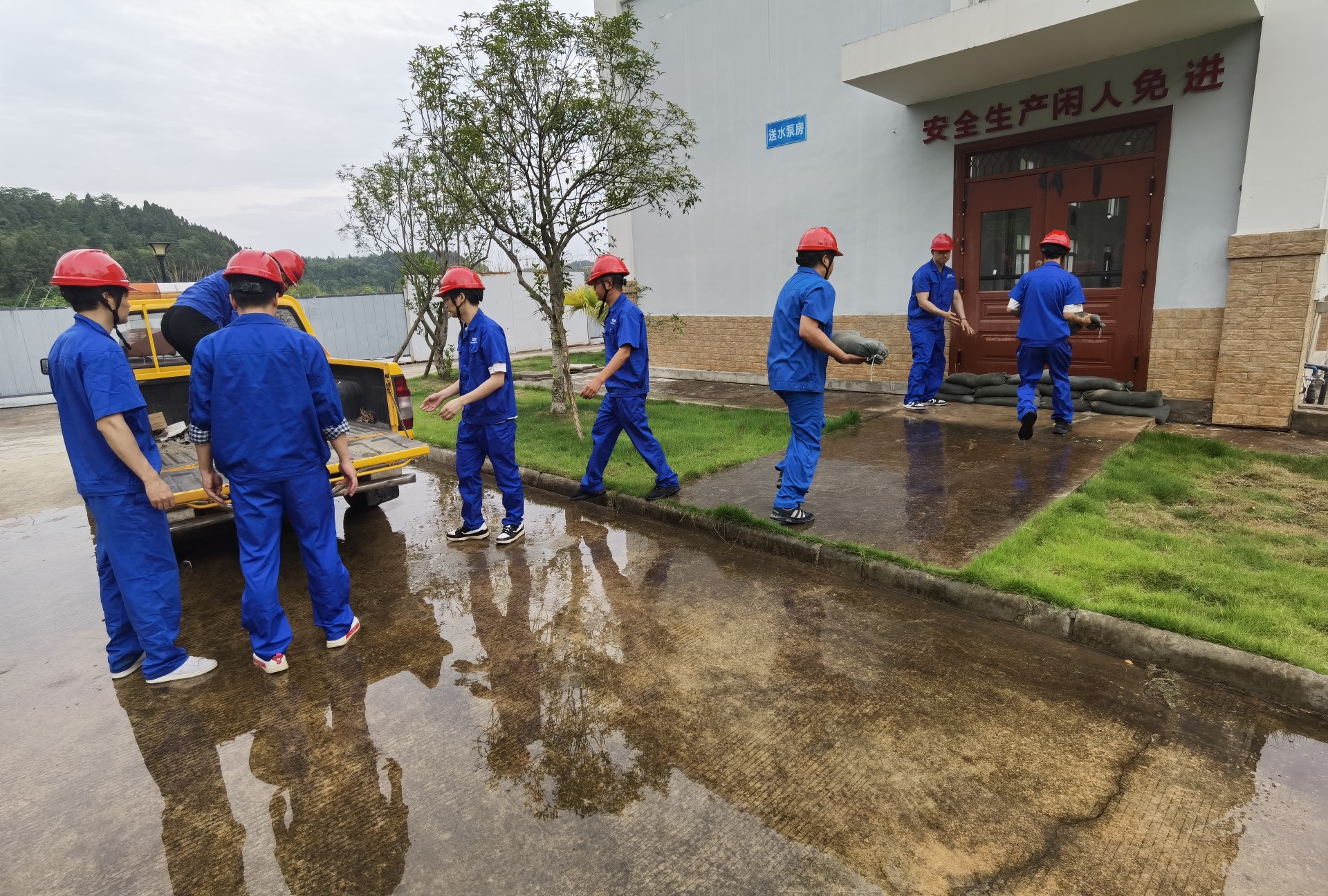 各部门迅速响应,抢险人员快速集结出动,车辆物资等后勤保障快速到位,用最快的速度赶赴险情点。装运沙袋、码袋堵漏、抽排积水、化验水质、疏通厂区内排洪沟,本次演练共出动抢险车3辆,参演人员达40余人。演练中,各组人员分工明确,指挥小组现场指挥有力,各个演练环节紧密有序,达到了预期效果和实战目的。